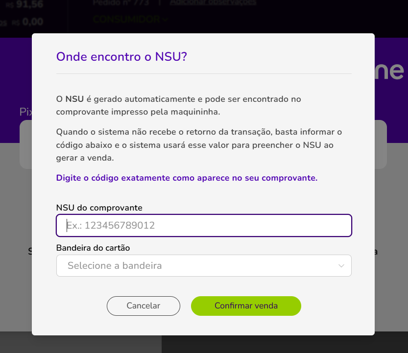 7. Se a transação foi aceita na maquininha, mas no sistema ainda conta como não recebido, será possível informar o NSU do comprovante e a Bandeira do Cartão para que a emissão fiscal seja feita.