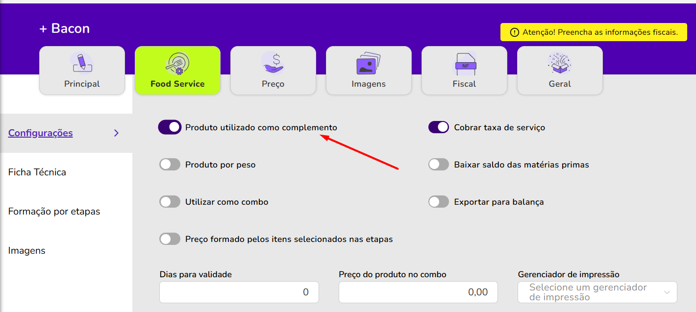 Produto utilizado como complemento: selecione essa opção em todos os complementos.