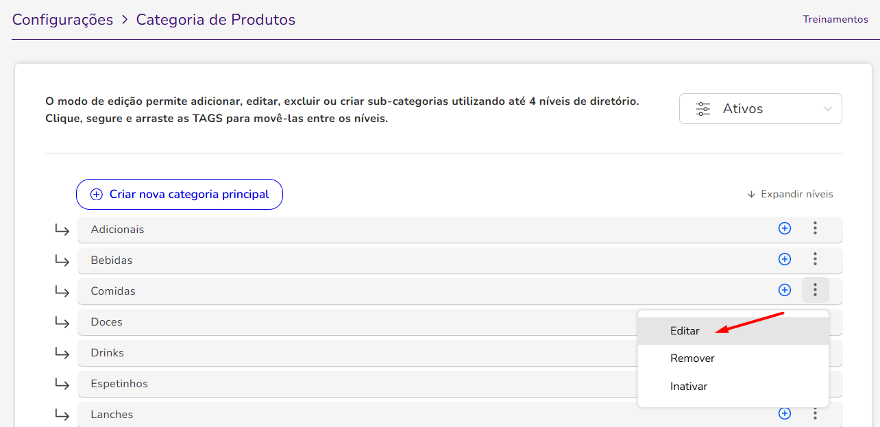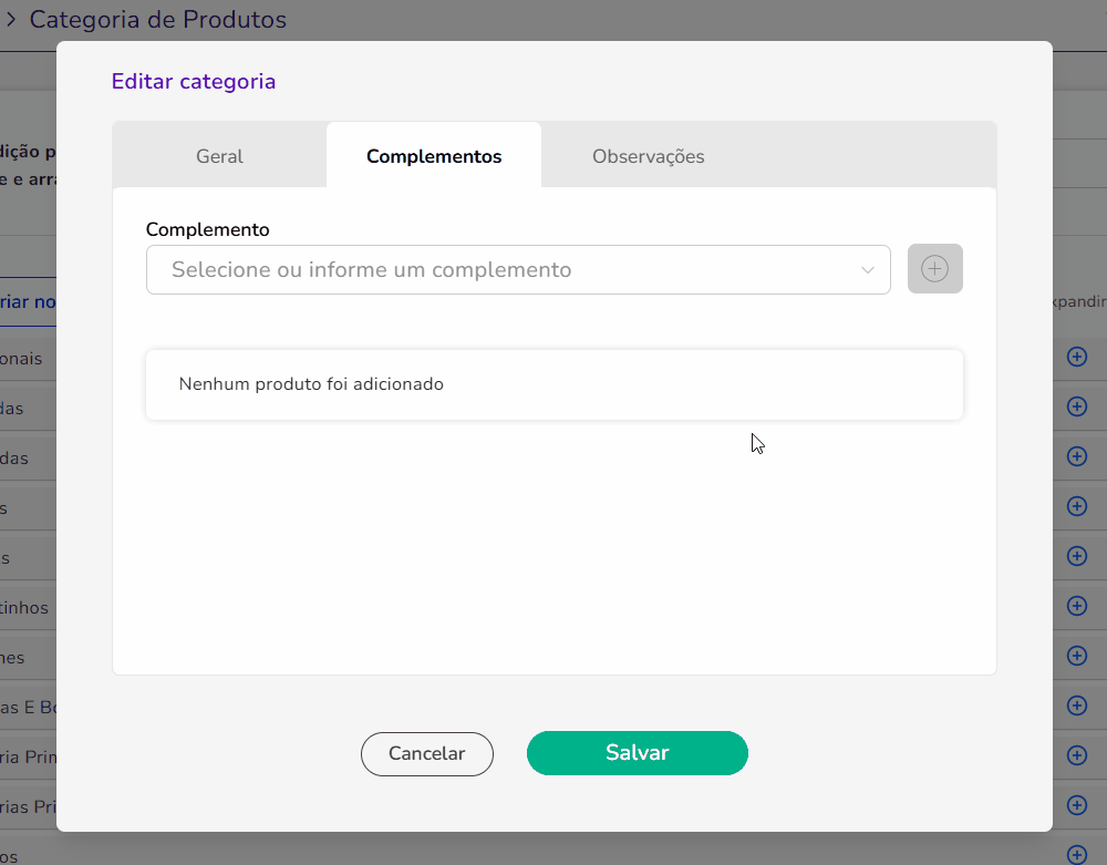Vá na aba Complementos, adicione os complementos relacionados a essa categoria de produtos e clique em Salvar.