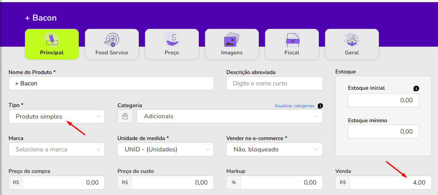 Estoque inicial: Se for controlar o estoque do produto, informe a quantidade de estoque inicial do produto e, após salvar, o sistema já fará o lançamento de entrada automaticamente.