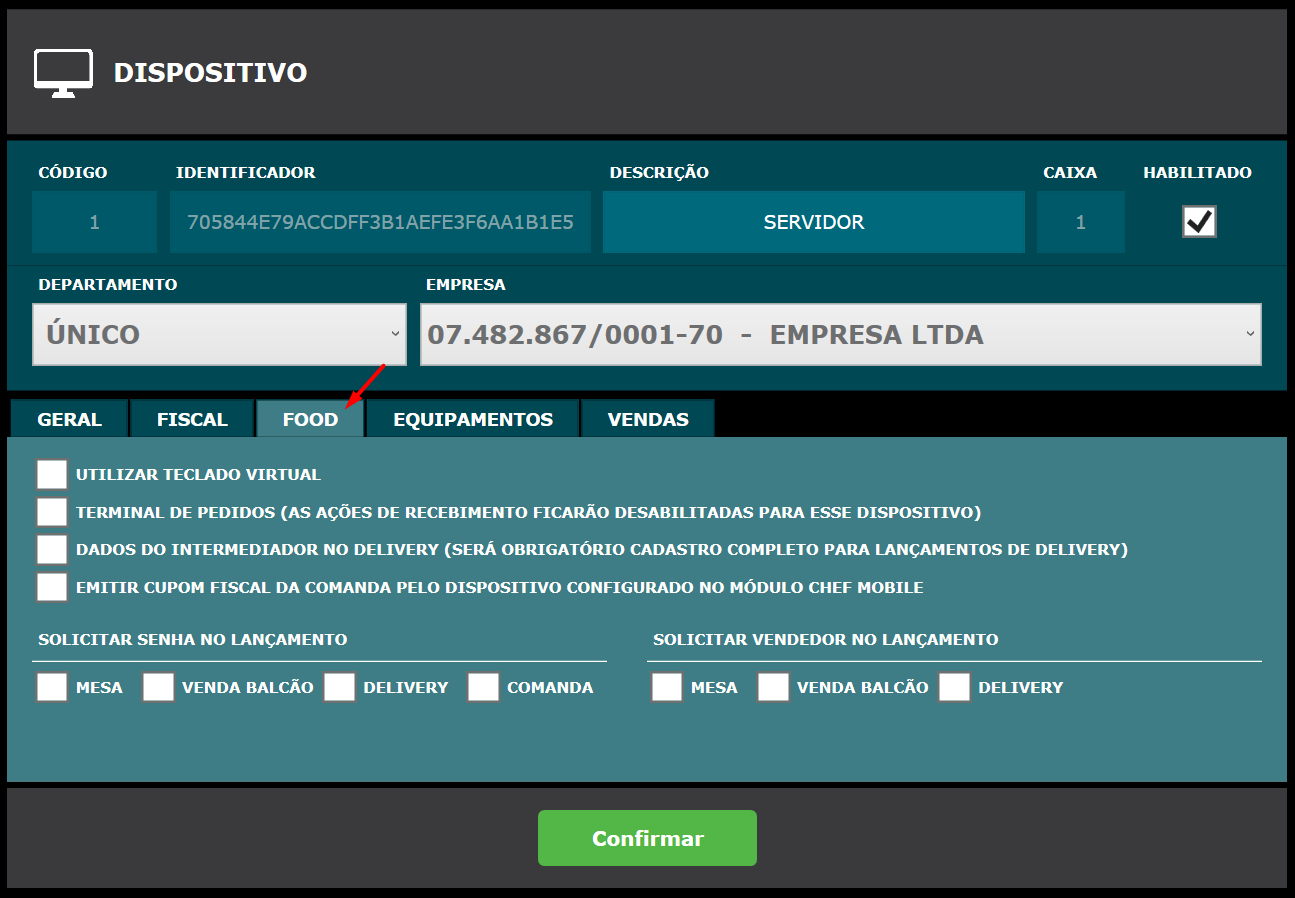 Terminal de pedidos (As ações de recebimento ficarão desabilitadas para esse dispositivo): Use esta função quando há um terminal de pedidos no salão para que os garçons lancem pedidos, sem realizar recebimentos (pagamentos). Isso impede que operações de caixa sejam feitas acidentalmente nesse terminal.