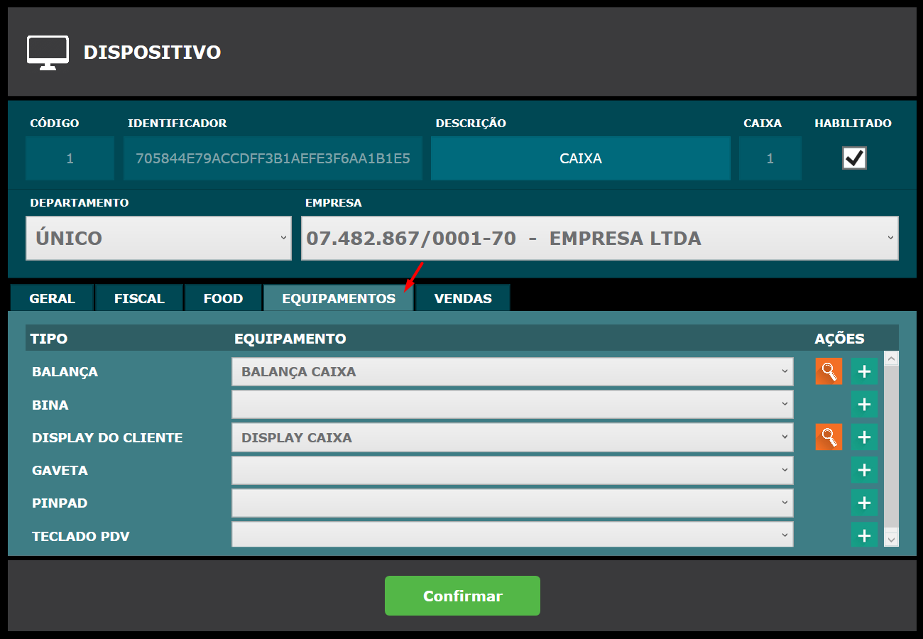 A aba Equipamentos permite configurar os dispositivos físicos que podem ser integrados ao dispositivo, como balanças, gavetas de dinheiro, displays e etc.