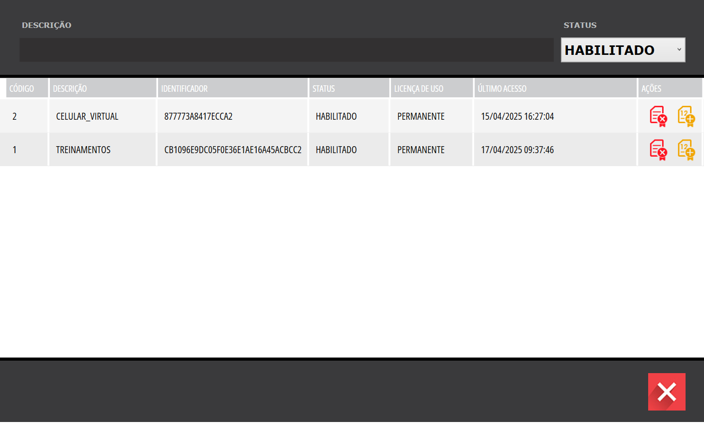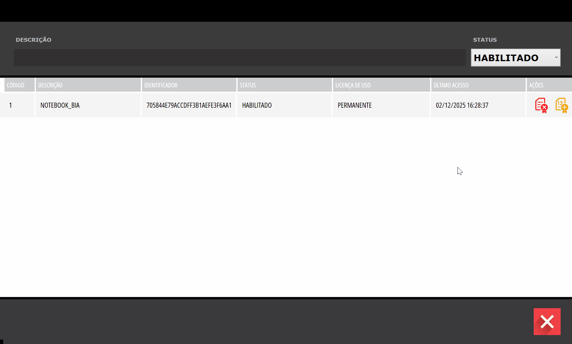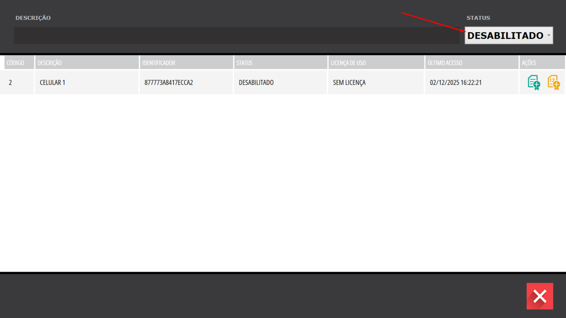 • Se tiver instalado o sistema em um novo dispositivo, altere o status para "Desabilitado" e serão mostrados os dispositivos pendentes de licenças:
