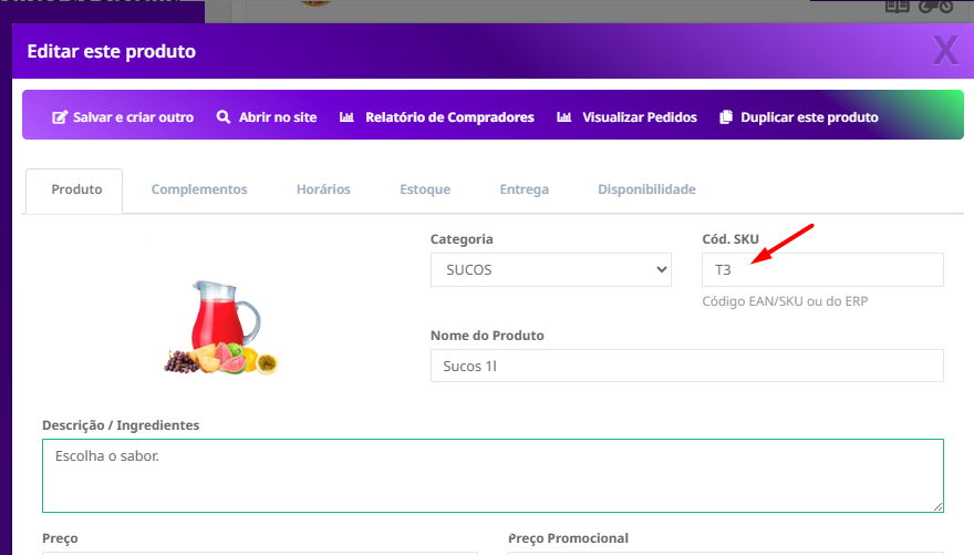 Se o produto não será integrado com nenhum produto do sistema, informe código aleatório, pois o campo não pode ficar em branco.