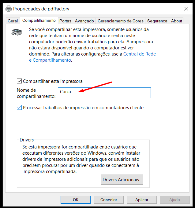 ⭐ Se estiver configurando o Gerenciador de Impressões, coloque o nome de compartilhamento igual ao nome da impressora virtual correspondente. Ex: CAIXA, COZINHA, BAR.