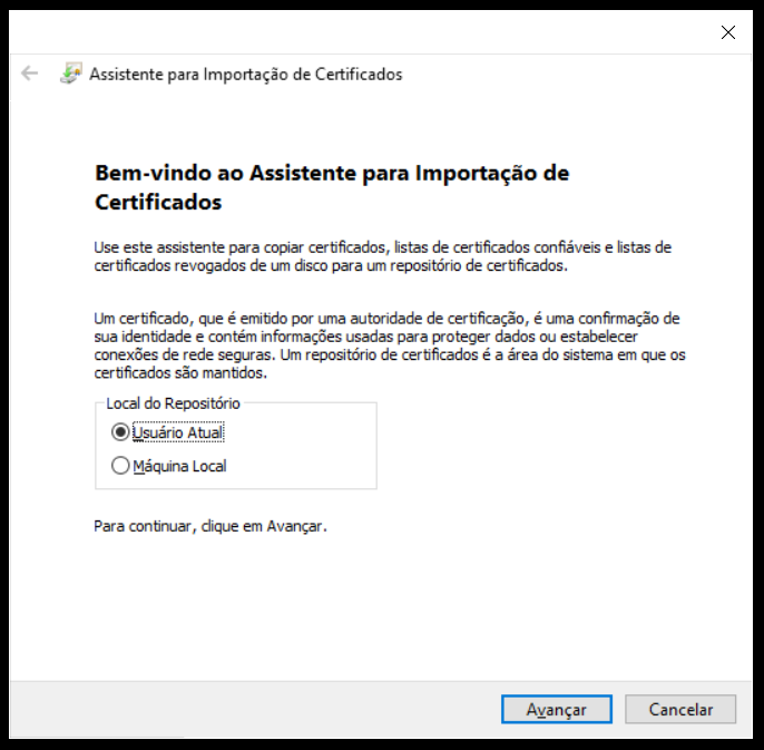 3. Defina onde será instalado: Será perguntado se você deseja instalar o certificado somente para o seu usuário atual ou para o seu computador (ou seja, para todos os usuários). Clique em Avançar.