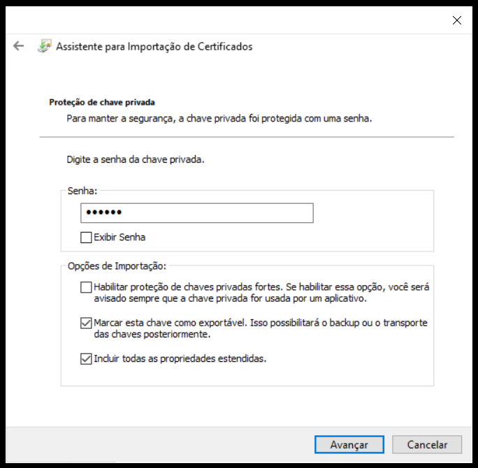 5. Informar a Senha e Configurar Opções: Informe a senha que foi criada quando o certificado digital foi gerado.