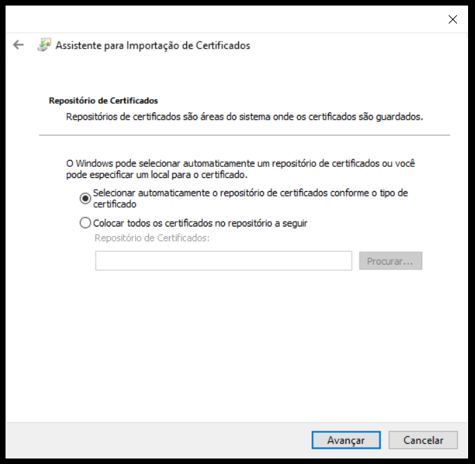 8. Selecionar o Local de Armazenamento: Indique se o próprio Windows deve selecionar onde o certificado será guardado, ou se você quer guardar em um lugar específico. No exemplo da fonte, seleciona-se que o próprio Windows escolha. Clique em Avançar.