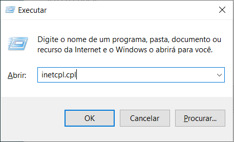 1. Pressione Windows + R e digite o comando "inetcpl.cpl".