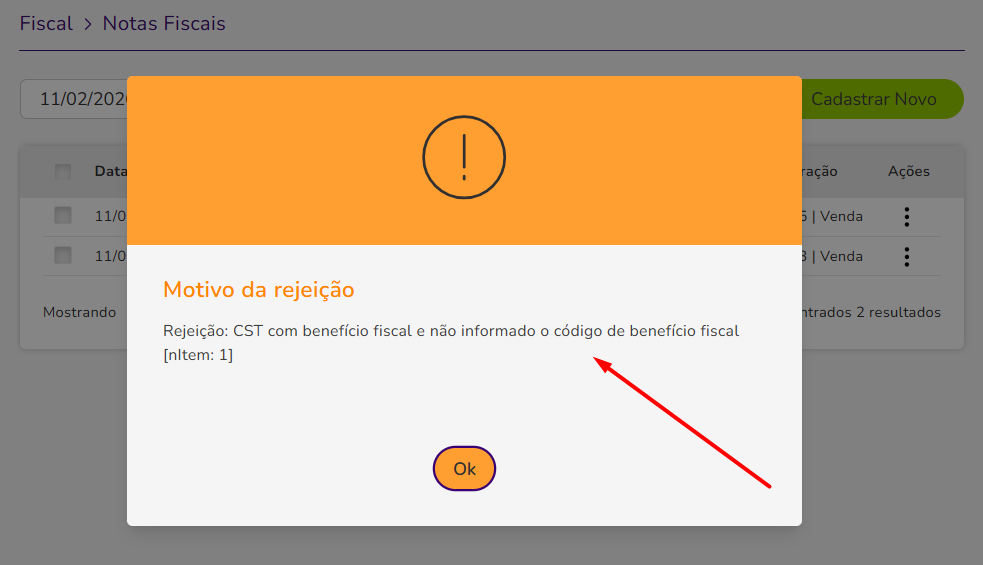 Se ainda estiver na tela de vendas, veja a rejeição na tarja vermelha apresentada:
